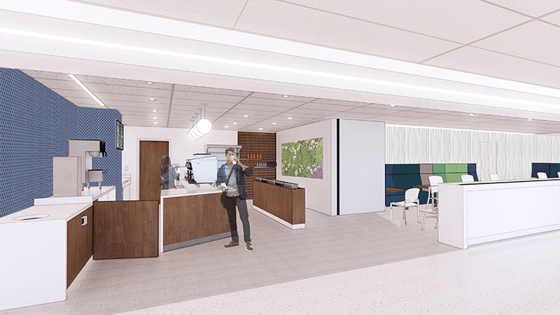 A spacious new coffee shop on the main level will include seating where visitors can relax with a cup of coffee and a snack.