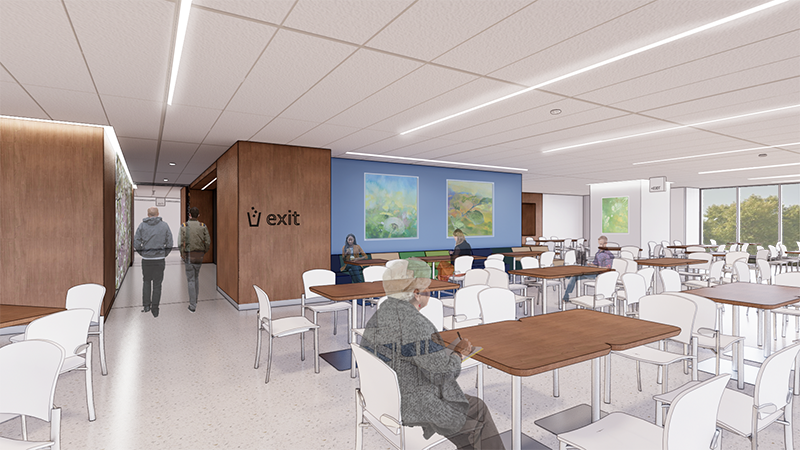 | Large windows in the new cafeteria will offer abundant natural light and views to landscaping and the outdoor seating. The botanicals theme can be seen in the artwork and wall colors. |