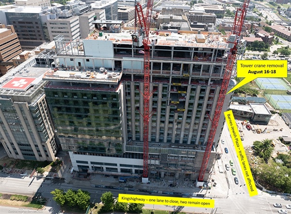 August 16, 2024 - A short two and a half years ago, the first of two tower cranes was erected along Kingshighway Boulevard to lift and move equipment and supplies for construction of the Plaza West Tower, the 16-story inpatient facility at Barnes-Jewish Hospital. Those cranes have lifted and placed literally tons of materials and supplies. The weekend of Aug. 16-18, one of those cranes will be dismantled.